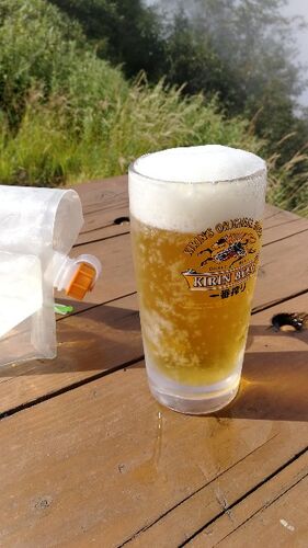 生ビール! 疲れた体に染み込みます! あいにくガスって眺めは残念ですが、ヤマで飲む生は格別です!